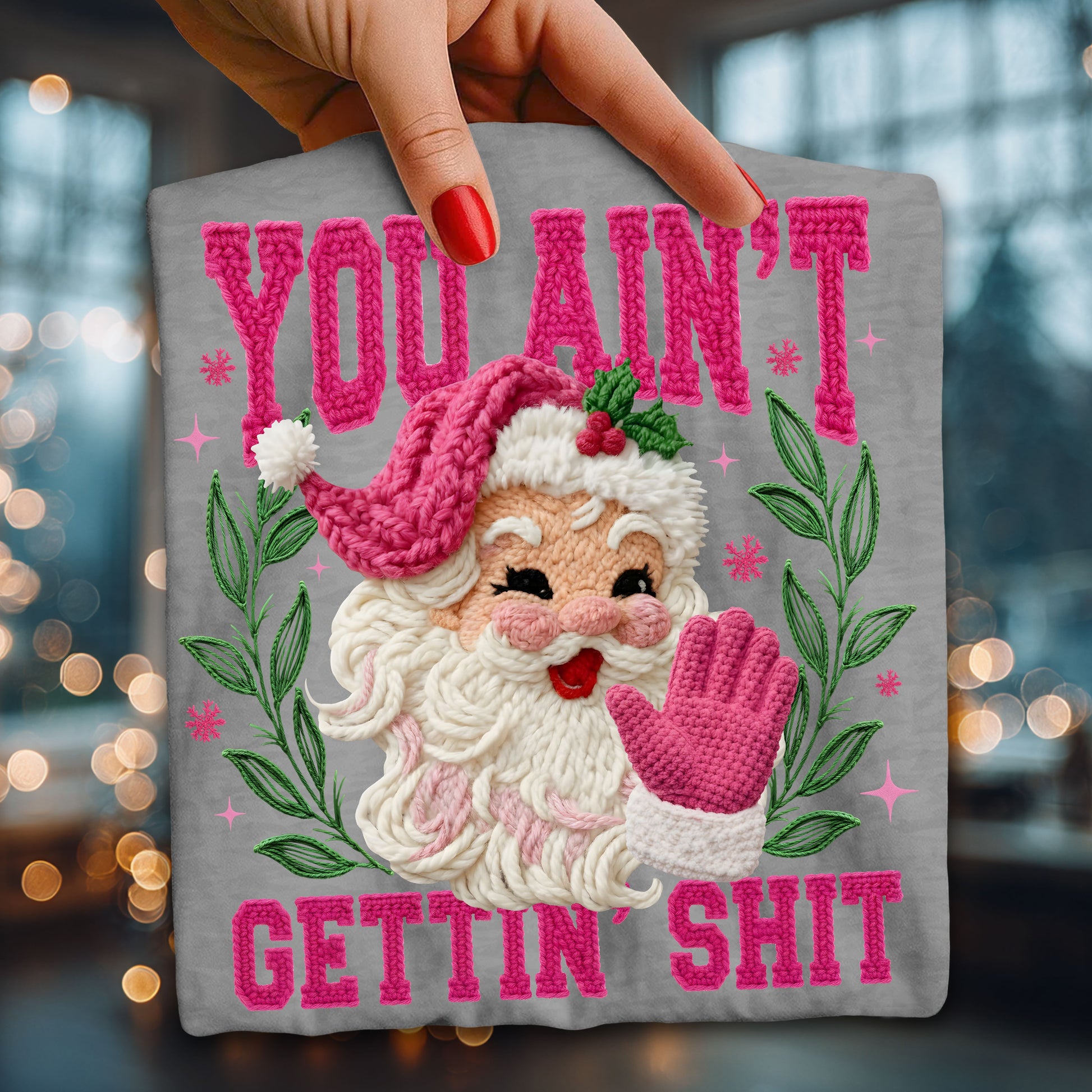 You Ain't Getting Sh*t for Christmas Graphic Design This cheeky graphic tee brings irreverent humor to your holiday wardrobe. Perfect for anyone with a bold sense of humor who refuses to take the season too seriouslyt. Comfortable, casual, and guaranteed to get laughs at holiday gatherings, family dinners, or just around town. Ideal for those who appreciate witty, unapologetic style with a festive twist. Not real yarn this a graphic design.
